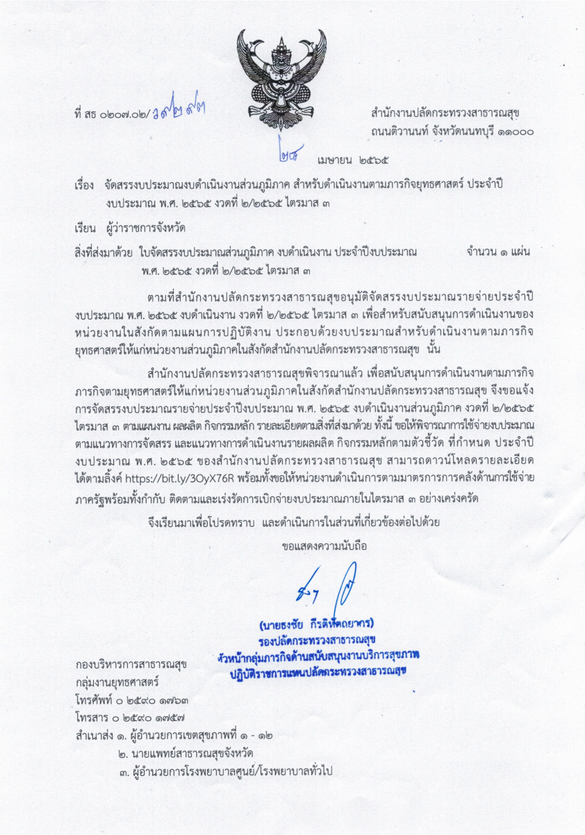 แจ้งจัดสรรงบประมาณ ตามภารกิจยุทธศาสตร์ ประจำปีงบประมาณ พ.ศ. 2565 งวดที่ 2/2565 ไตรมาส 3