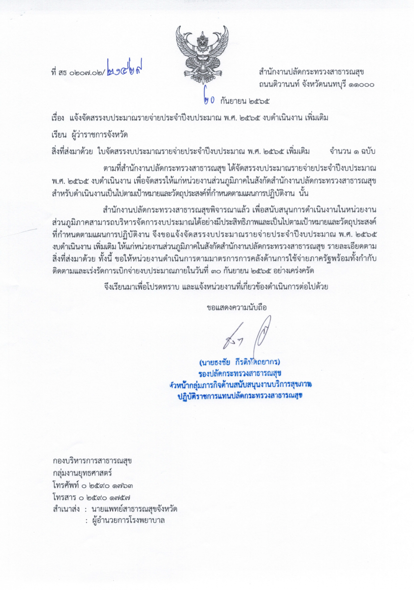 แจ้งจัดสรรงบประมาณรายจ่ายประจำปีงบประมาณ พ.ศ. 2565 งบดำเนินงาน เพิ่มเติม
