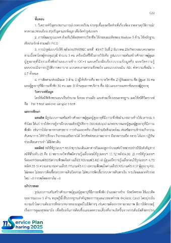 หลัง9.33 5) ความสามารถค่าเฉลี่ย3.77(เกณฑ์3.41) 6)ความพึงพอใจค่าเฉลี่ย3.92(เกณฑ์3.41)7.ผู้สูงอายุADL