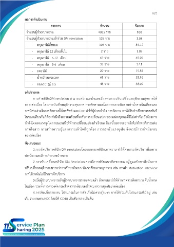 1.การจัดบริการคลินิก DM remission โดยแยกจากคลินิกเบาหวาน ทำให้สามารถจัดบริการที่เฉพาะ
