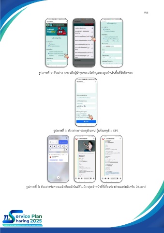 W5 รูปภาพที่ 3: ตัวอย่าง อสม.หรือผู้นำชุมชน แจ้งข้อมูลของลูกบ้านในพื้นที่รับผิดชอบ รูปภาพที่ 4: ตัวอย่างการระบุตำแหน่งผู้แจ้งเหตุด้วย GPS รูปภาพที่ 5: ตัวอย่างข้อความแจ้งเตือนอัตโนมัติไปยังกลุ่มเจ้าหน้าที่ที่เกี่ยวข้องผ่านแอปพลิเคชัน Discord