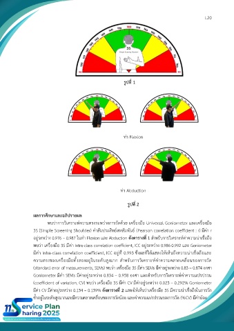 อยู่ระหว่าง 0.976 – 0.987 ในท่า Flexion และ Abduction ดังตารางที่ 1 สำหรับการวิเคราะห์ค่าความน่าเชื่อถือ