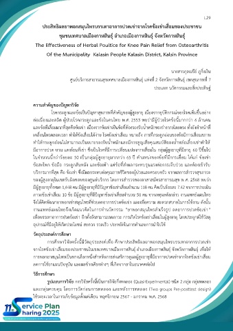 การศึกษาวิจัยครั้งนี้มีวัตถุประสงค์เพื่อ ศึกษาประสิทธิผลยาพอกสมุนไพรบรรเทาอาการปวดเข่า