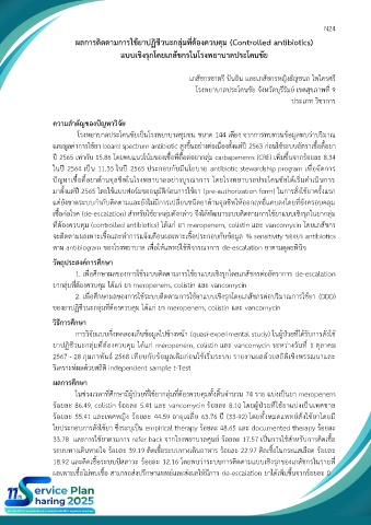 ร้อยละ 86.49, colistin ร้อยละ 5.41 และ vancomycin ร้อยละ 8.10 โดยผู้ป่วยที่ใช้ยาแบ่งเป็นเพศชาย
