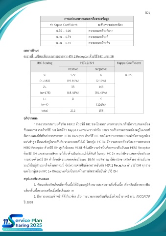 กับผลการตรวจด้วยวิธี ISH โดยมีค่า Kappa Coefficient เท่ากับ 0.827 ระดับความสอดคล้องอยู่ในเกณฑ์