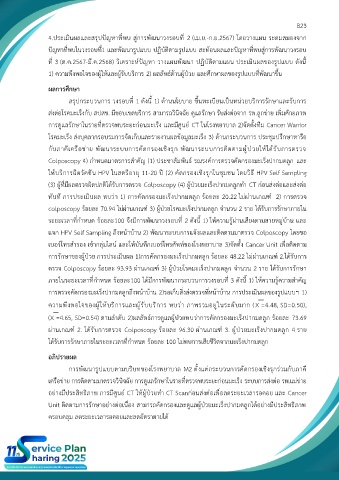 ผ่านเกณฑ์ 2. ได้รับการตรวจ Colposcopy ร้อยละ 96.30 ผ่านเกณฑ์ 3. ผู้ป่วยมะเร็งปากมดลูก 4 ราย